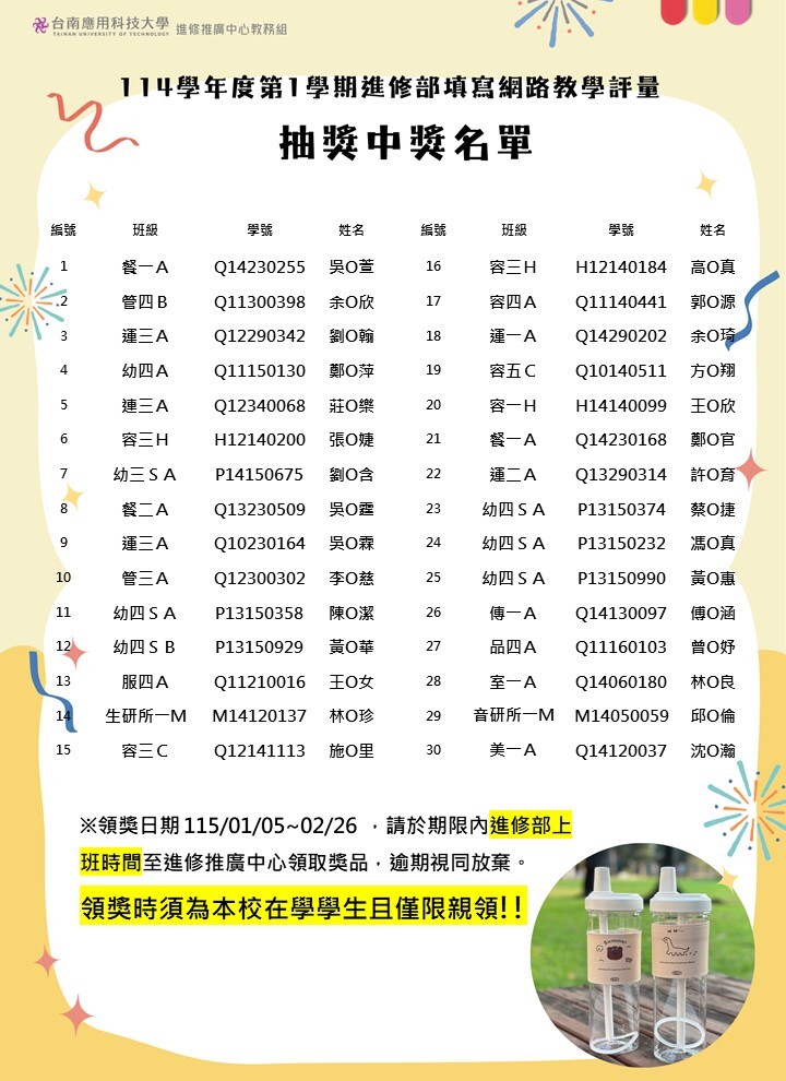 【公告】114學年度第1學期進修部填寫網路教學評量抽籤中獎名單