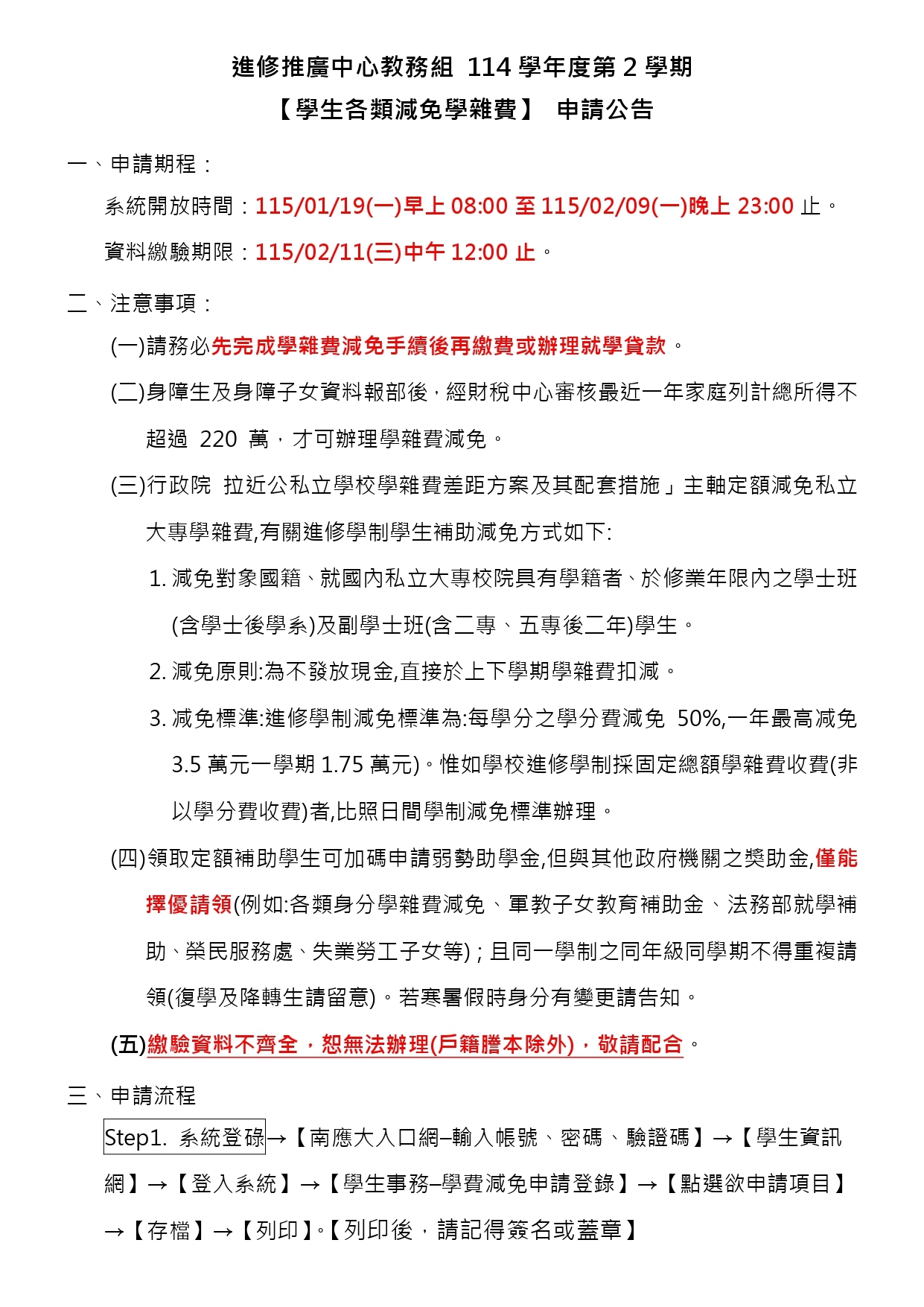 【減免】114.2各類學雜費減免申請公告-第二梯次