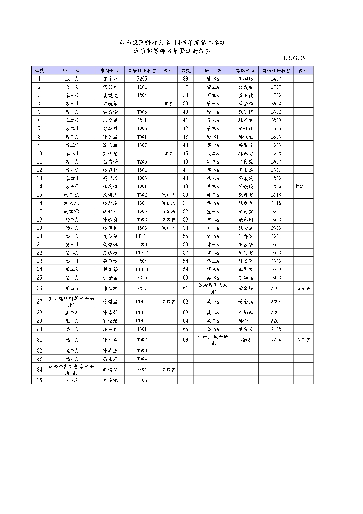 【公告】114-2進修部導師名冊暨開學註冊教室